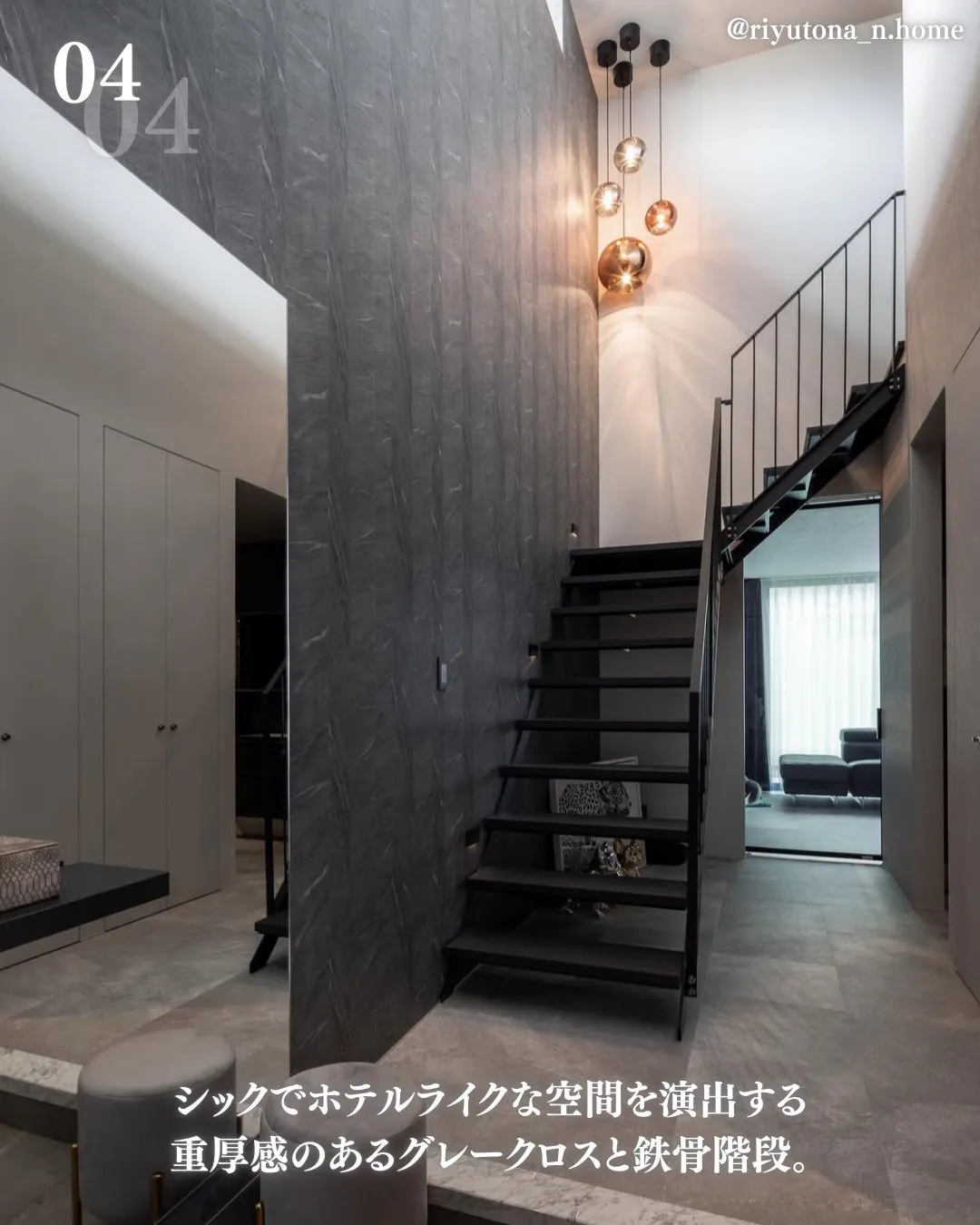 シックでホテルライクな空間を演出する重厚感のあるグレークロスと鉄骨階段。