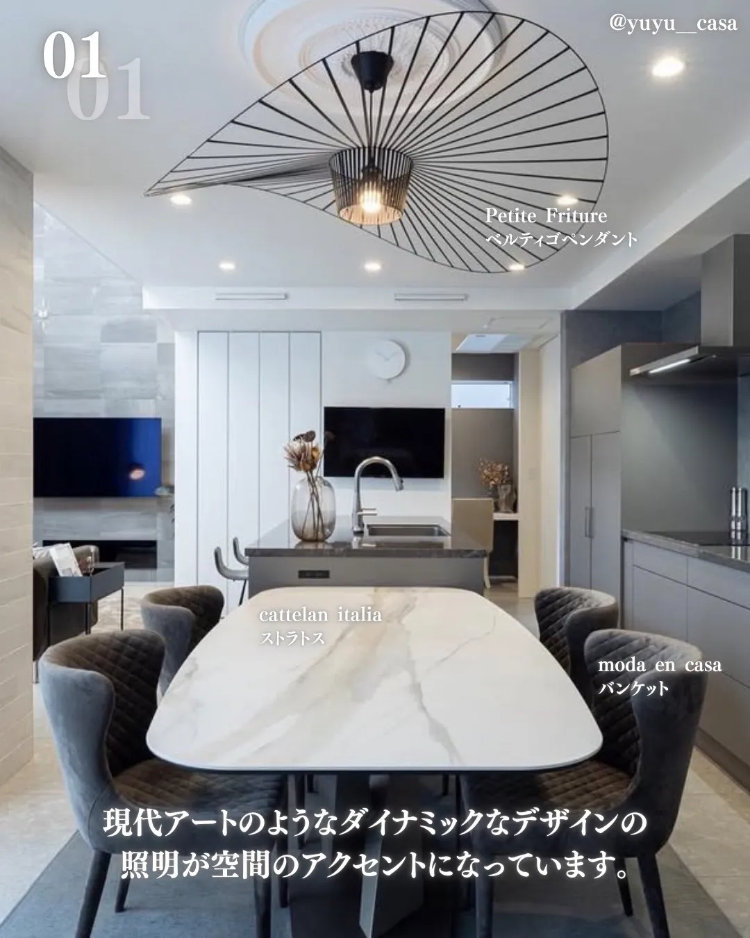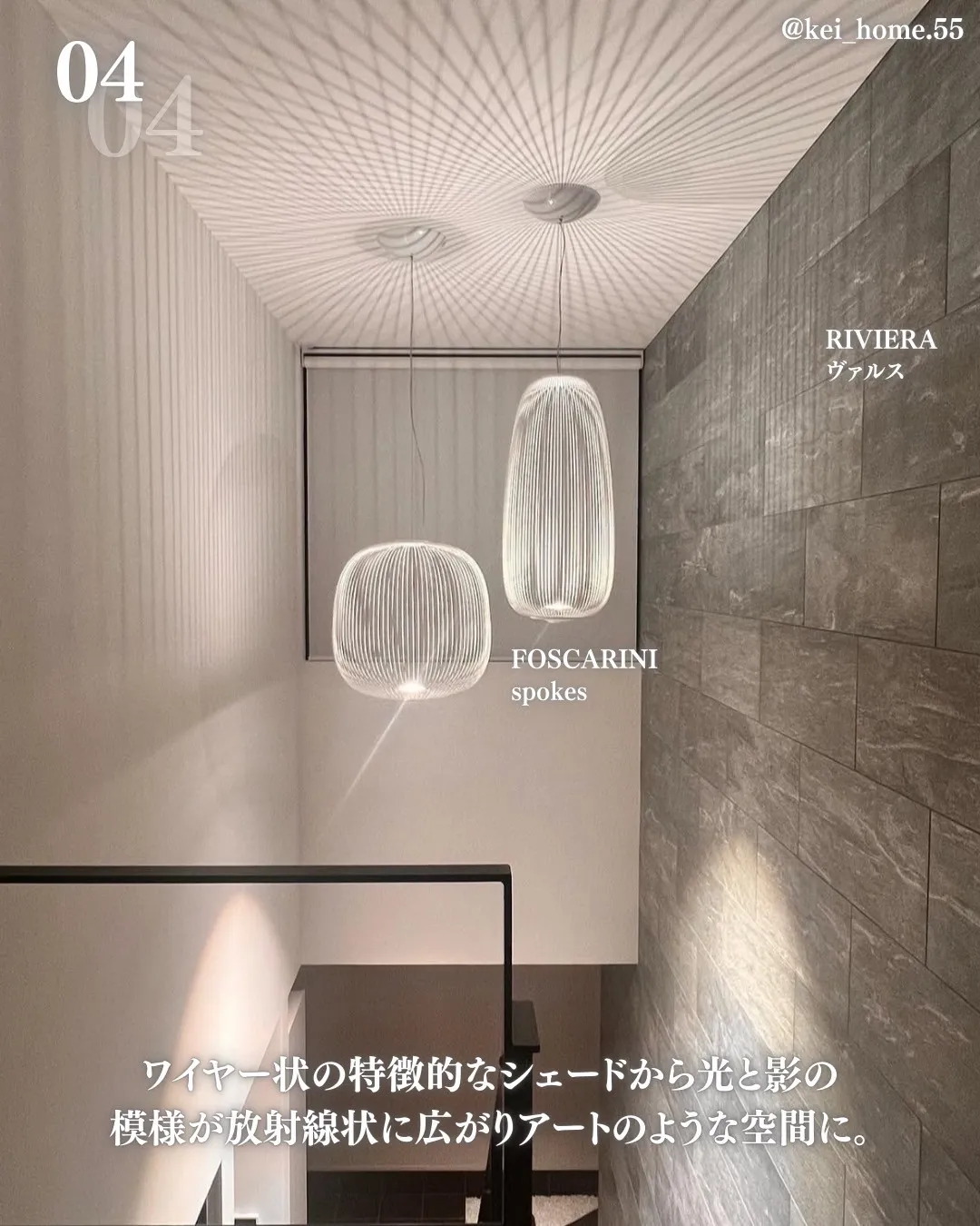 FOSCARINI spokesはワイヤー状の特徴的なシェードから光と影の模様が放射線状に広がりアートのような空間に。