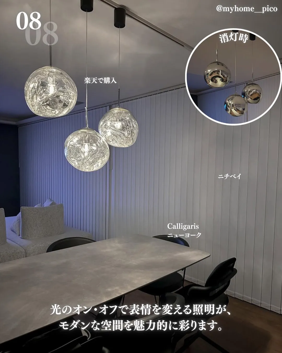 光のオン・オフで表情を変える照明が、モダンな空間を魅力的に彩ります。
