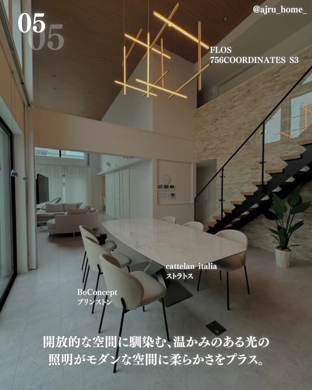 FLOS 756Coordinates S3は開放的な空間に馴染む、温かみのある光の照明がモダンな空間に柔らかさをプラス。
