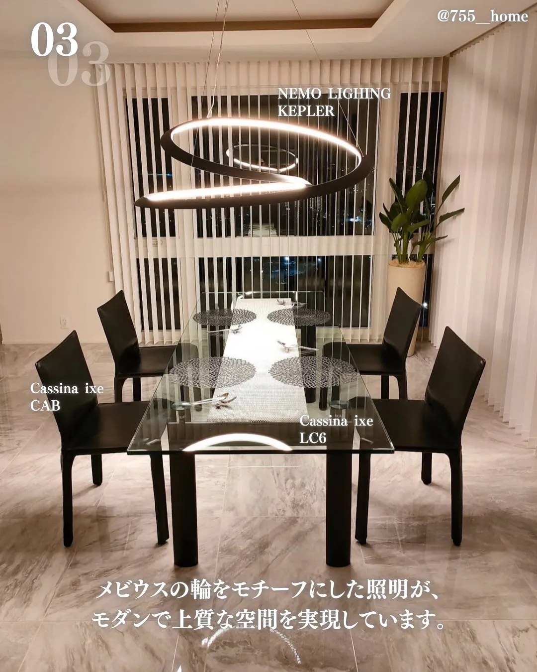 NEMOLIGHTINGのKEPLERはメビウスの輪をモチーフにした照明が、モダンで上質な空間を実現しています。