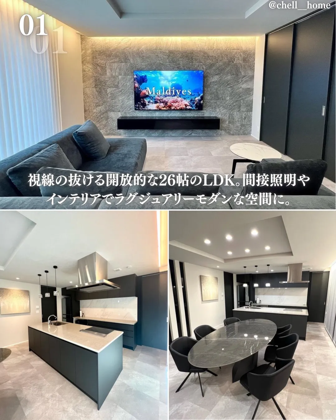 視線の抜ける開放的な28.5帖のLDK。間接照明や