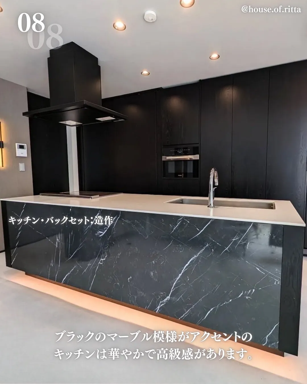 ブラックのマーブル模様がアクセントのキッチンは華やかで高級感があります。