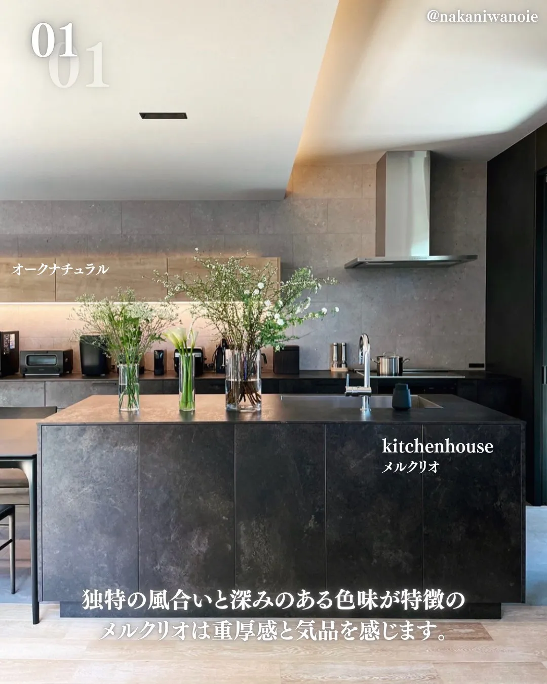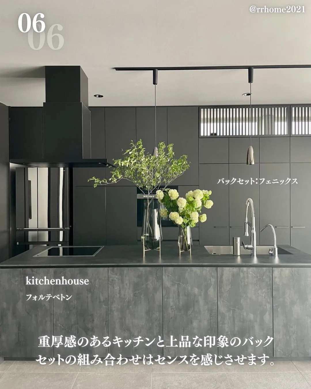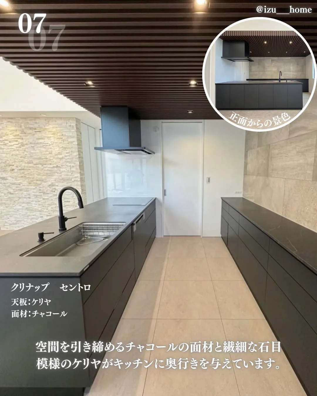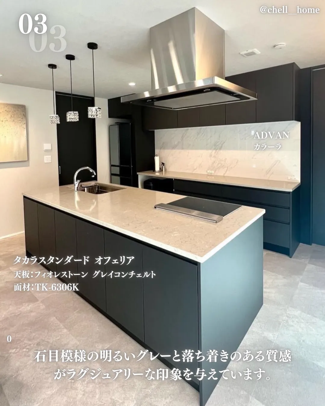 空間を引き締めるチャコールの面材と繊細な石目模様のケリヤがキッチンに奥行きを与えています。