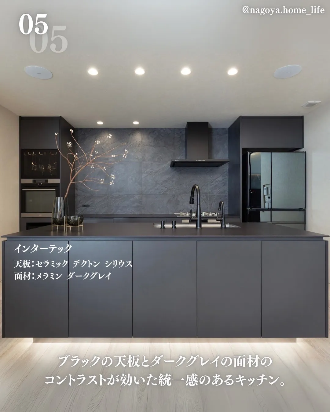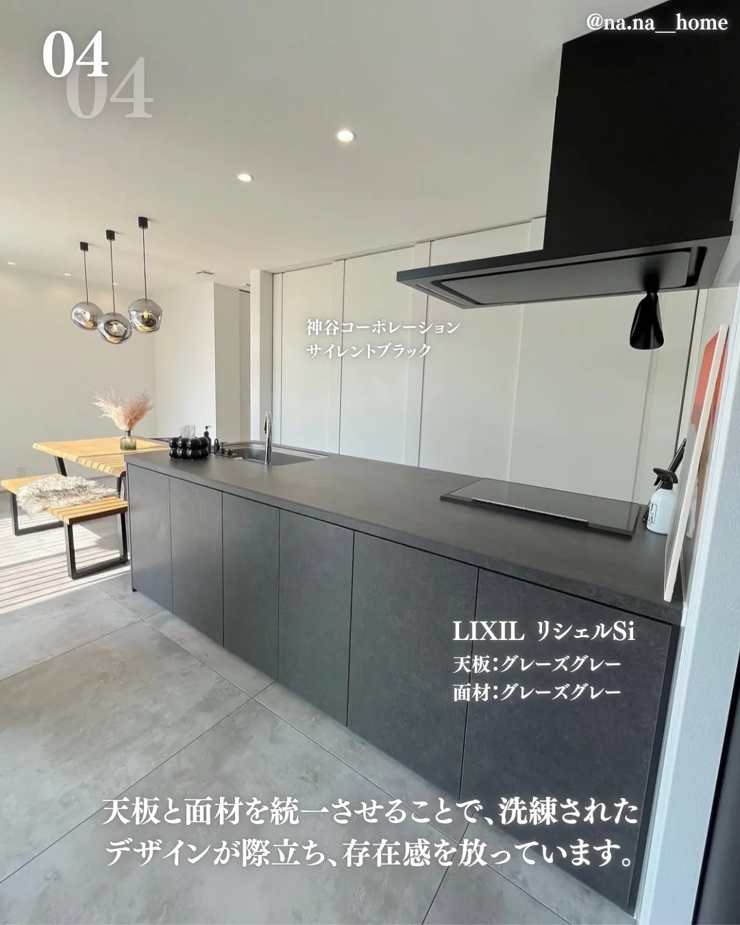 ブラックの天板とダークグレイの面材のコントラストが効いた統一感のあるキッチン。