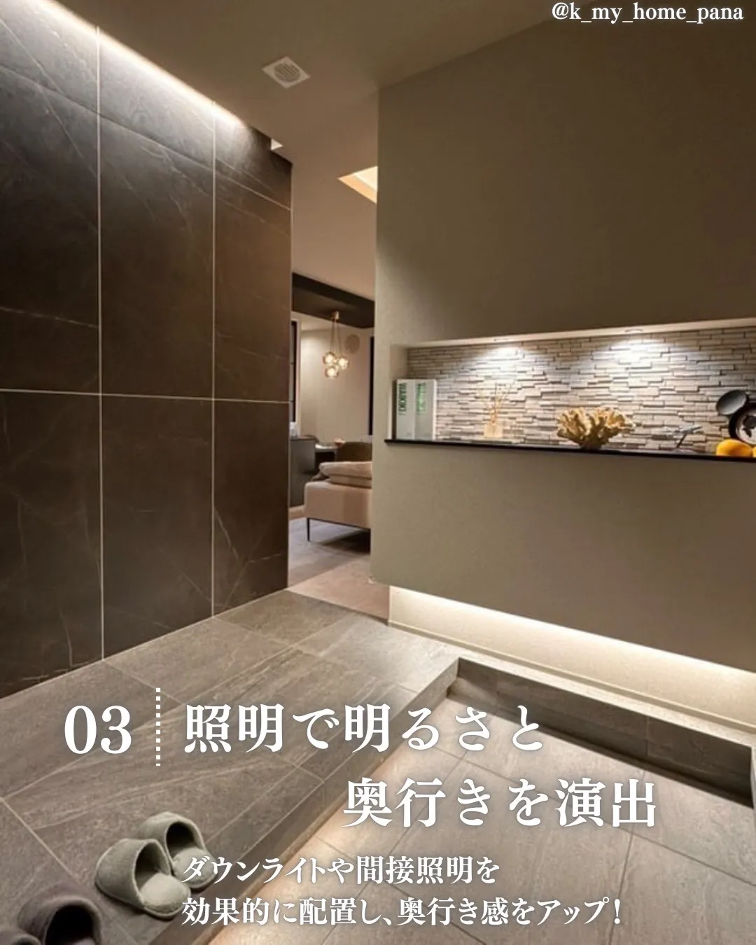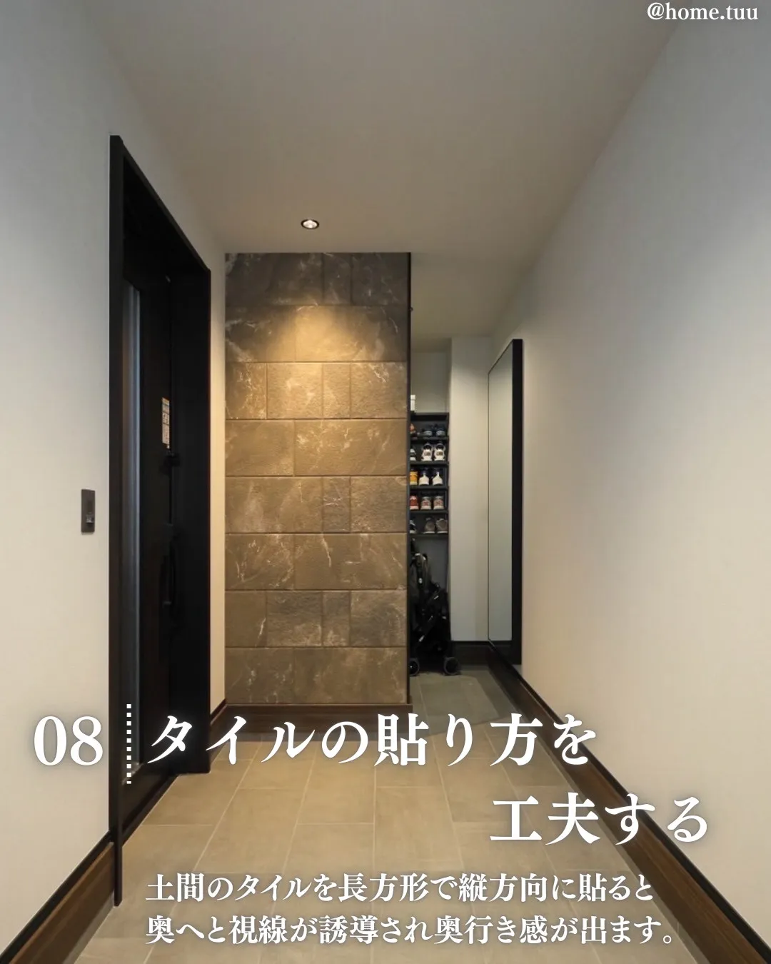 土間のタイルを長方形で縦方向に貼ると奥へと視線が誘導され奥行き感が出ます。