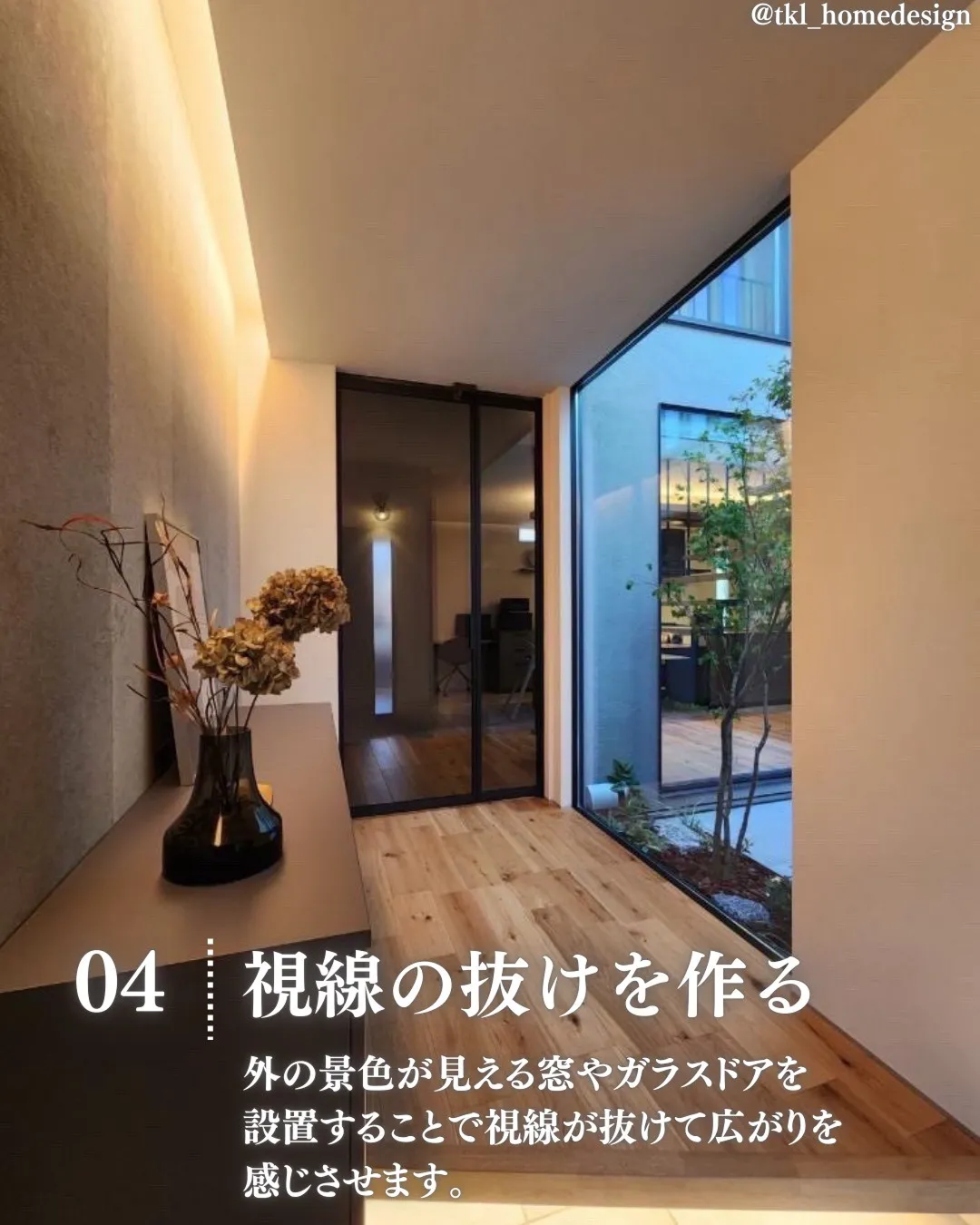 外の景色が見える窓やガラスドアを設置することで視線が抜けて広がりを感じさせます。