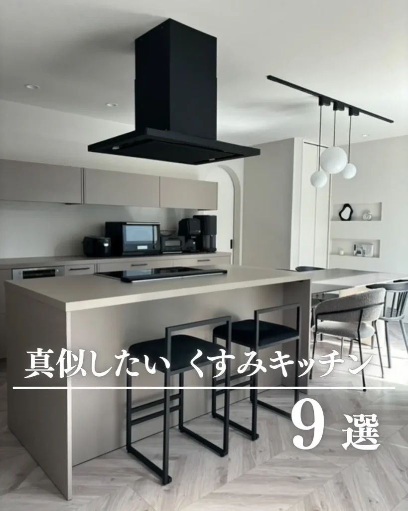 クールさと温かみが融合するアッシュベージュのキッチン。ブラックアイテムでスタイリッシュな空間に。(@8103_no_ie さんのお家)
