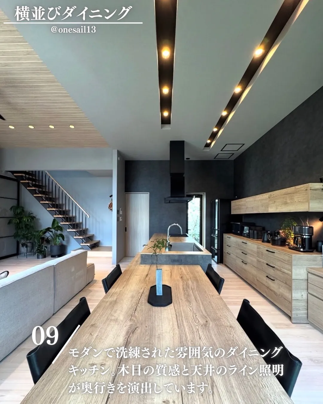 モダンで洗練された雰囲気のダイニングキッチン。木目の質感と天井のライン照明が奥行きを演出しています。