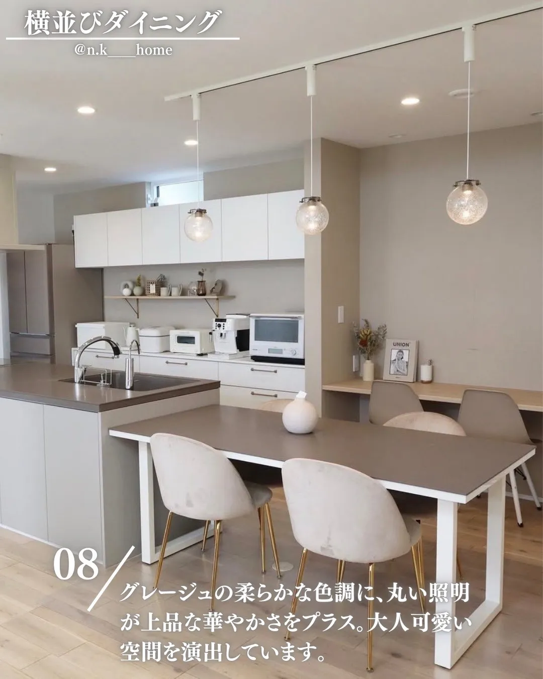 グレージュの柔らかな色調に、丸い照明が上品な華やかさをプラス。大人可愛い空間を演出しています。