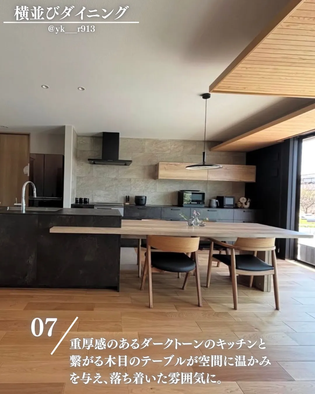 重厚感のあるダークトーンのキッチンと繋がる木目のテーブルが空間に温かみを与え、落ち着いた雰囲気に。