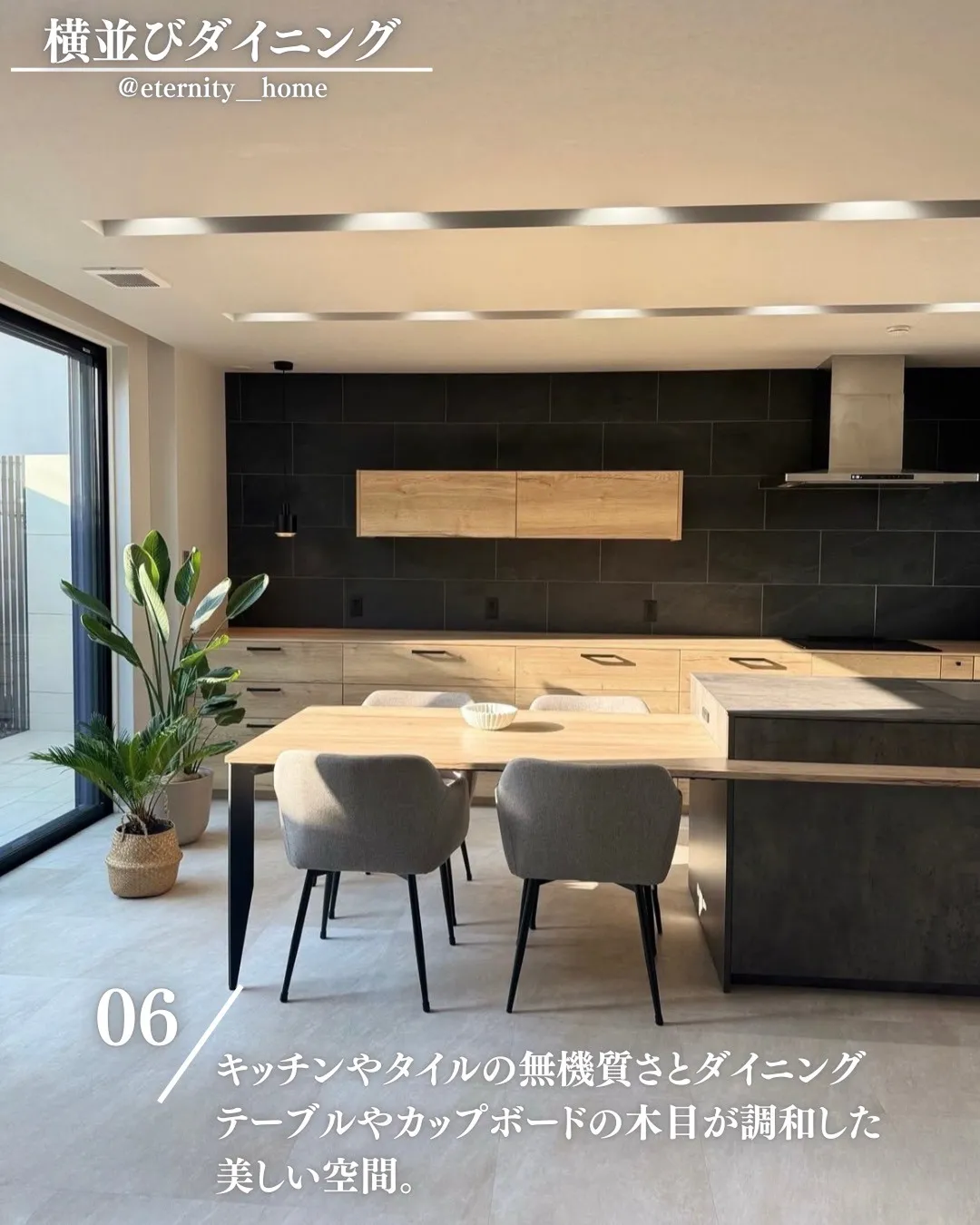 キッチンやタイルの無機質さとダイニングテーブルやカップボードの木目が調和した美しい空間。