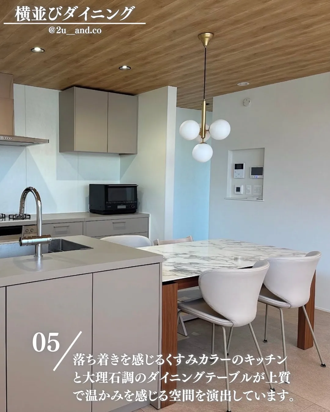 落ち着きを感じるくすみカラーのキッチンと大理石調のダイニングテーブルが上質で温かみを感じる空間を演出しています。