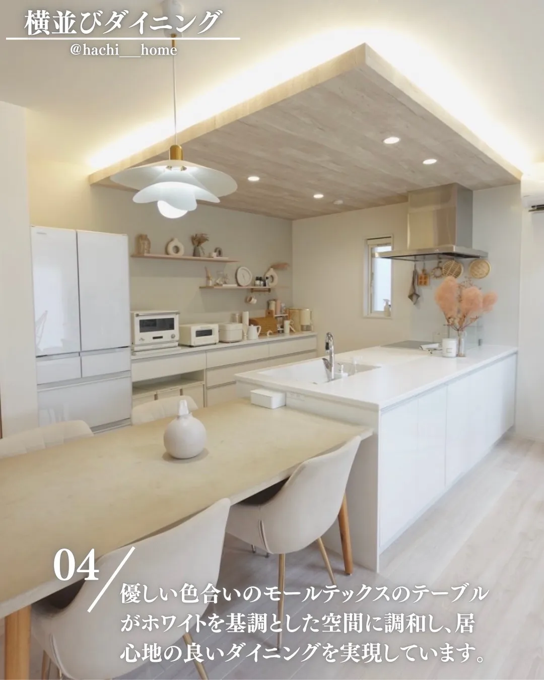 優しい色合いのモールテックスのテーブルがホワイトを基調とした空間に調和し、居心地の良いダイニングを実現しています。