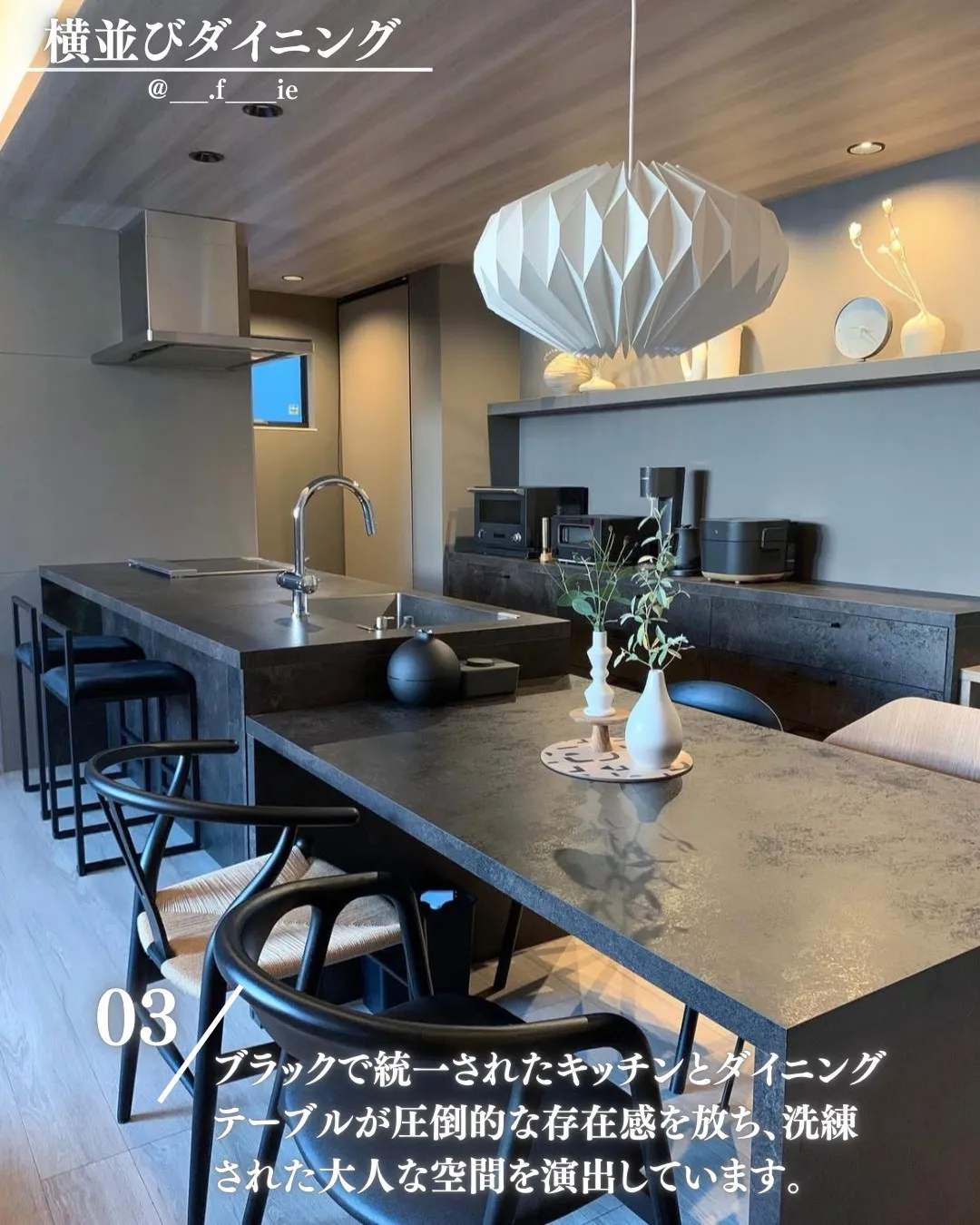 ブラックで統一されたキッチンとダイニングテーブルが圧倒的な存在感を放ち、洗練された大人な空間を演出しています。
