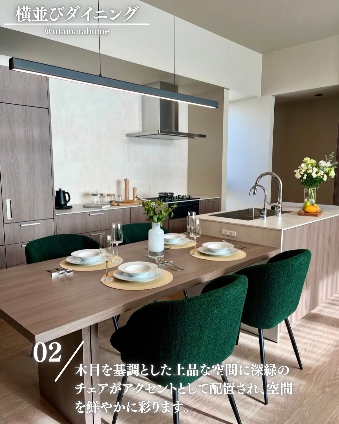 木目を基調とした上品な空間に深緑のチェアがアクセントとして配置され、空間を鮮やかに彩ります。