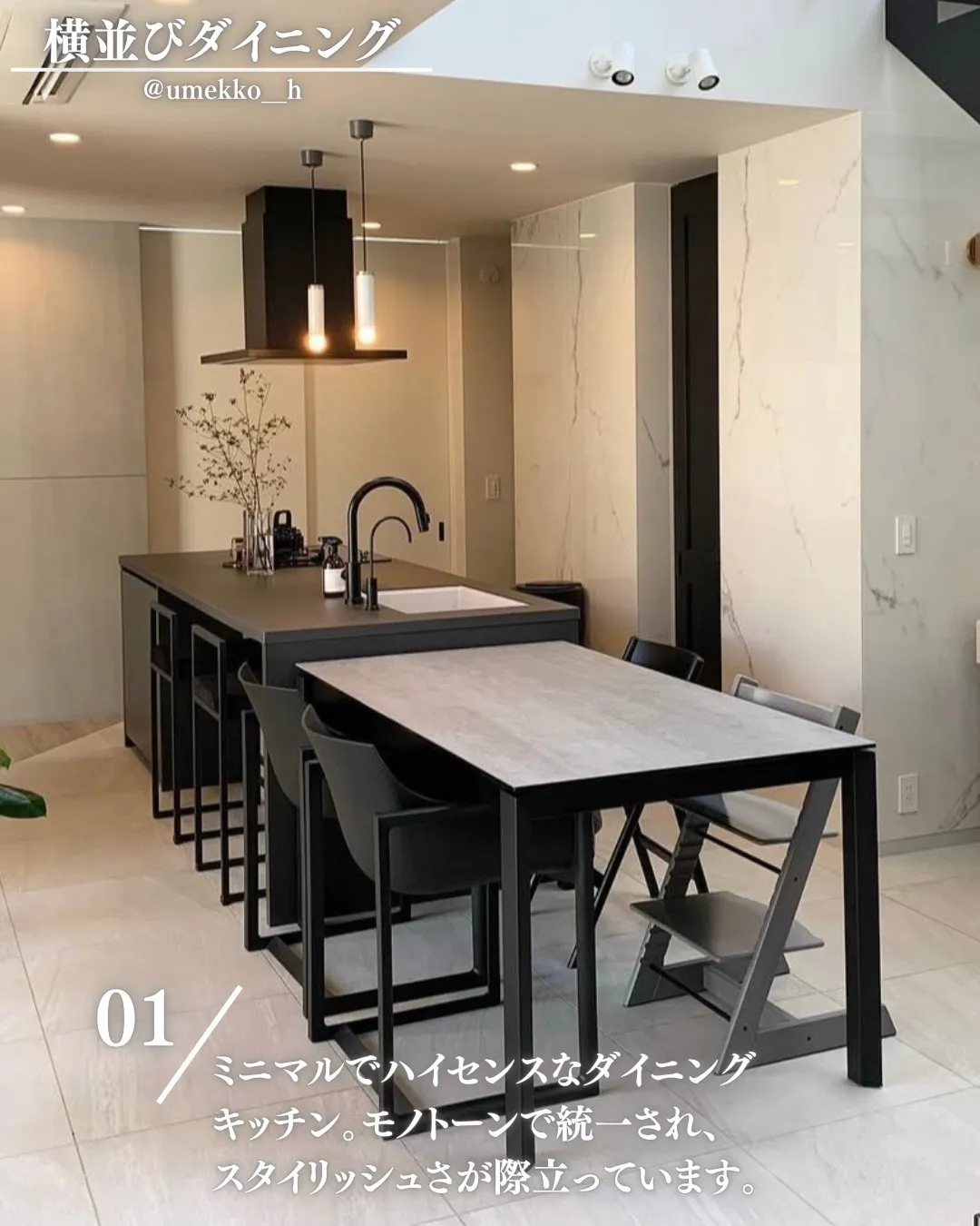 ミニマルでハイセンスなダイニングキッチン。モノトーンで統一され、スタイリッシュさが際立っています。
