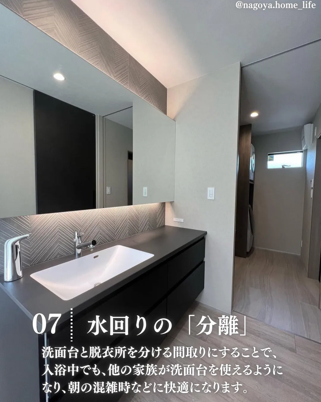 洗面台と脱衣所を分ける間取りにすることで、入浴中でも、他の家族が洗面台を使えるようになり、朝の混雑時などに快適になります。
