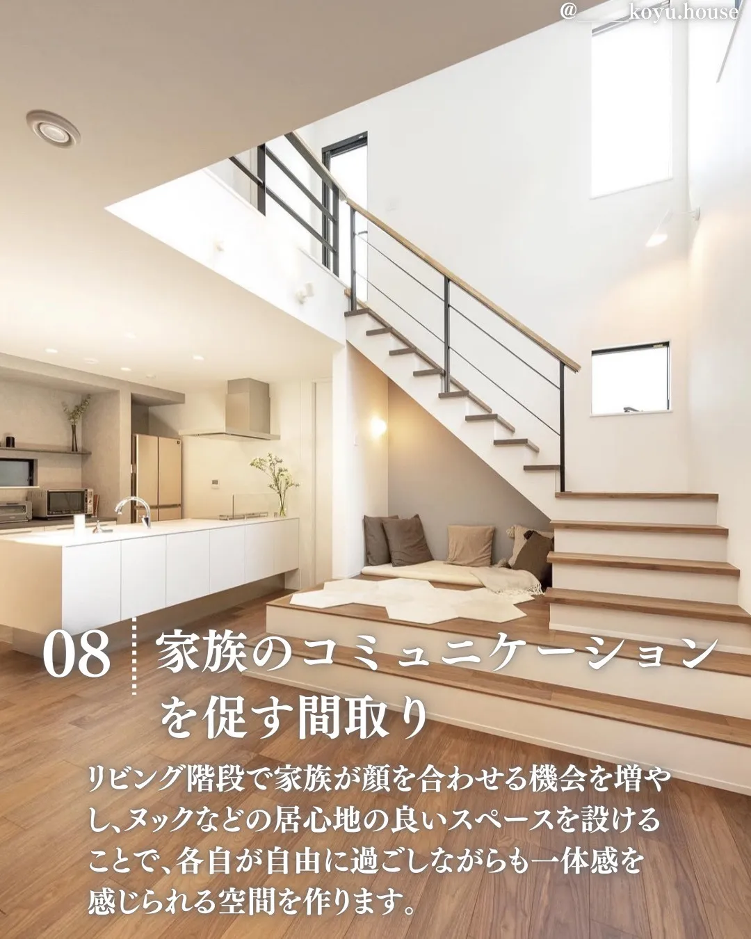 リビング階段で家族が顔を合わせる機会を増やし、ヌックなどの居心地の良いスペースを設けることで、各自が自由に過ごしながらも一体感を感じられる空間を作ります。