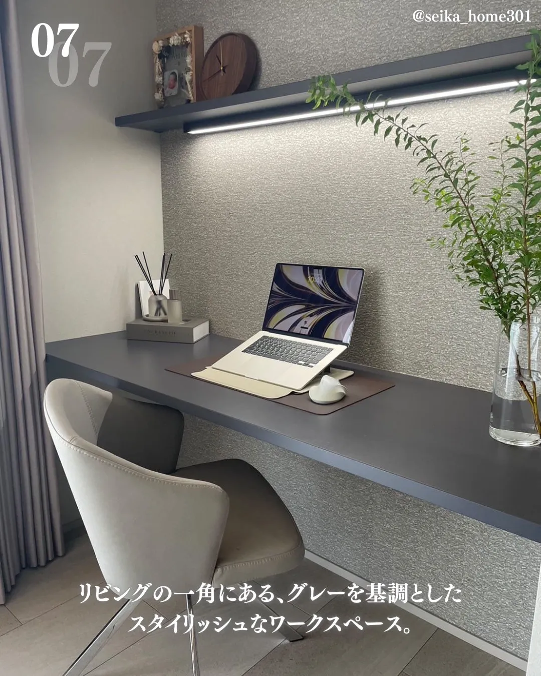 リビングの一角にある、グレーを基調としたスタイリッシュなワークスペース。