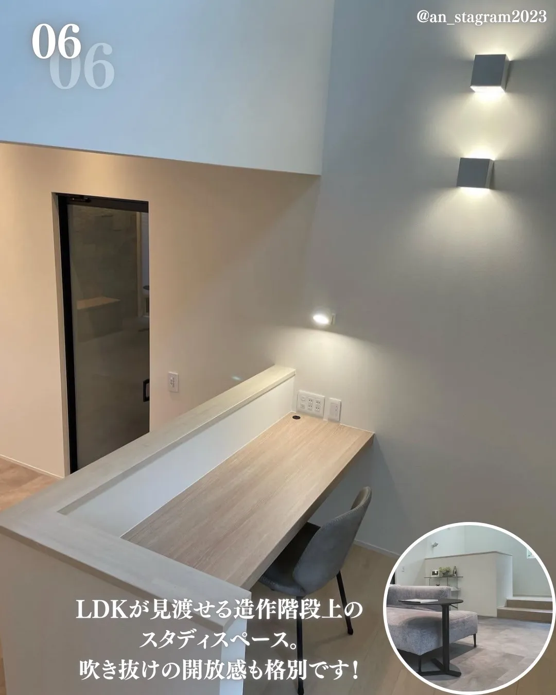LDKが見渡せる造作階段上のスタディスペース。吹き抜けの開放感も格別です!