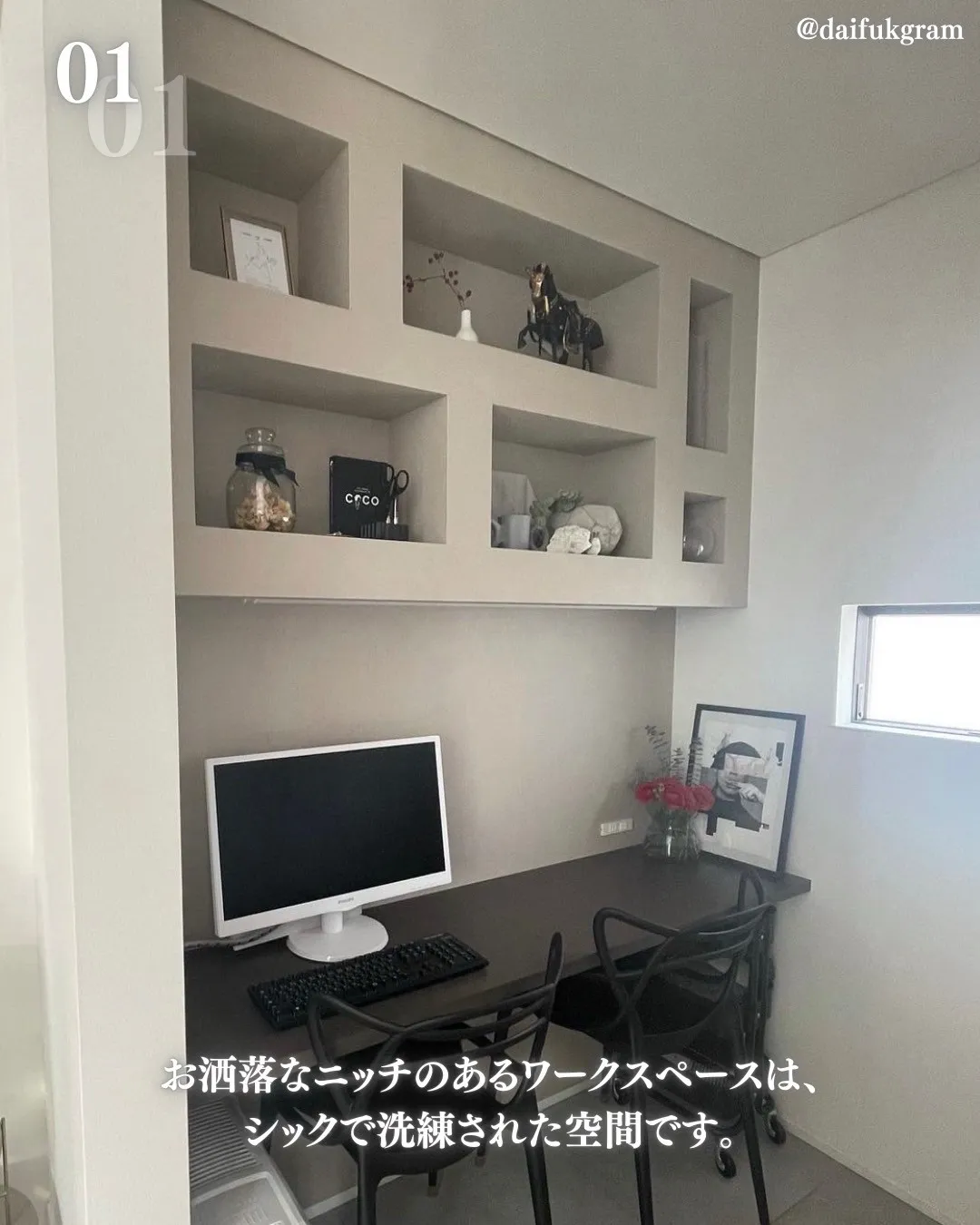 お洒落なニッチのあるワークスペースは、シックで洗練された空間です。