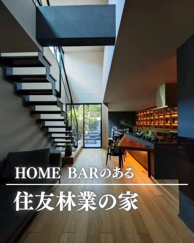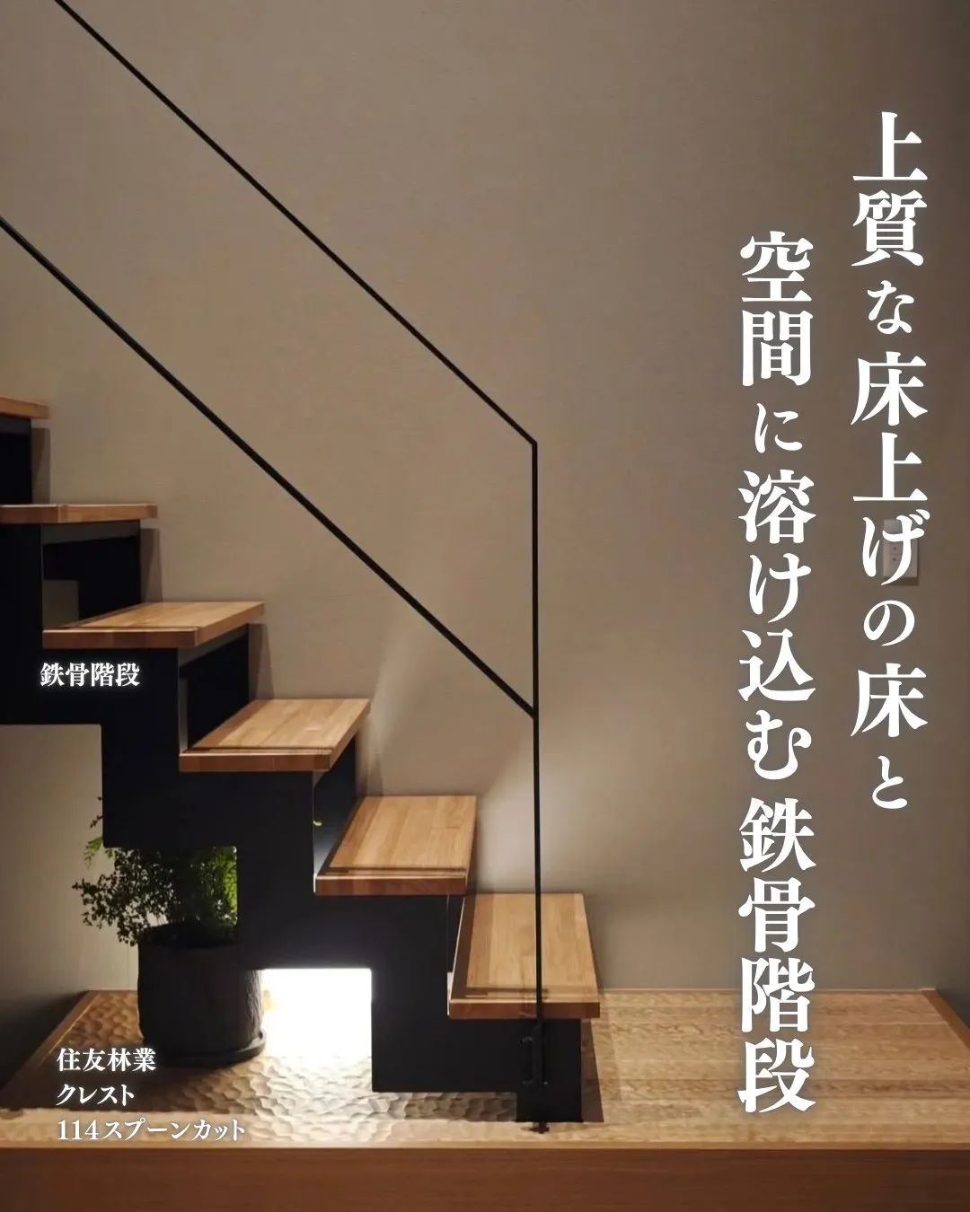 住友林業のクレスト 114スプーンカットの上質な床上げの床と空間に溶け込む鉄骨階段