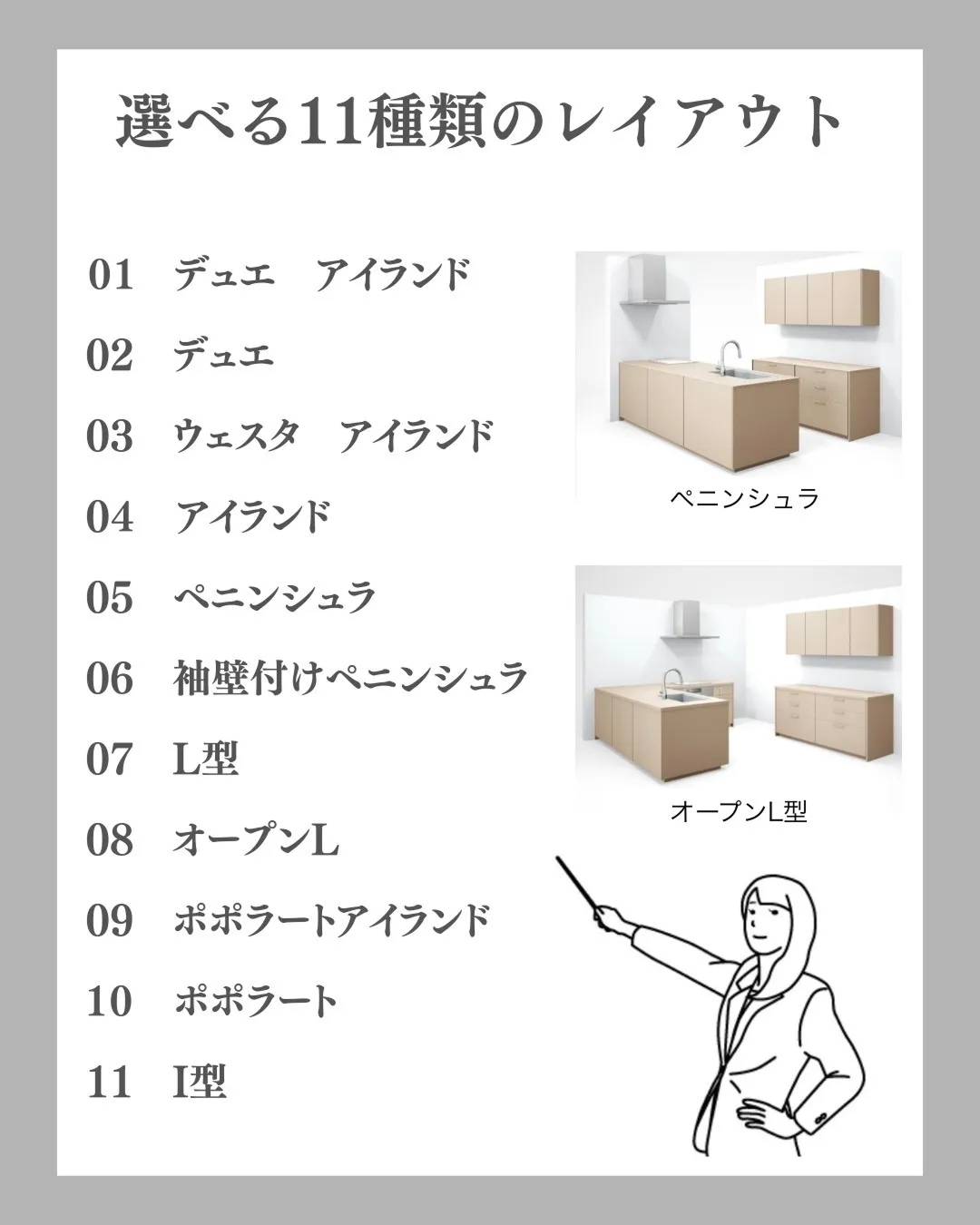 デュエ アイランド、デュエ、ウェスタ アイランド、アイランド、ペニンシュラ、袖壁付けペニンシュラ、L型、オープンL、ポポラートアイランド、ポポラート、ペニンシュラ、オープンL型。の11種類のレイアウトから選ぶことができます!