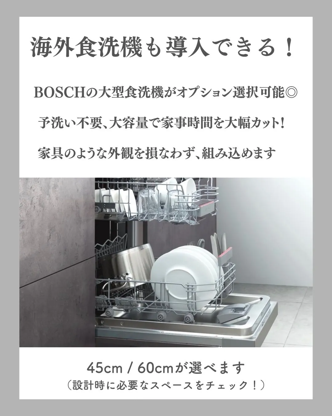 海外食洗機も導入できる! BOSCHの大型食洗機がオプション選択可能◎ 予洗い不要、大容量で家事時間を大幅カット! 家具のような外観を損なわず、組み込めます。45cm/60cmが選べます(設計時に必要なスペースをチェック!)。