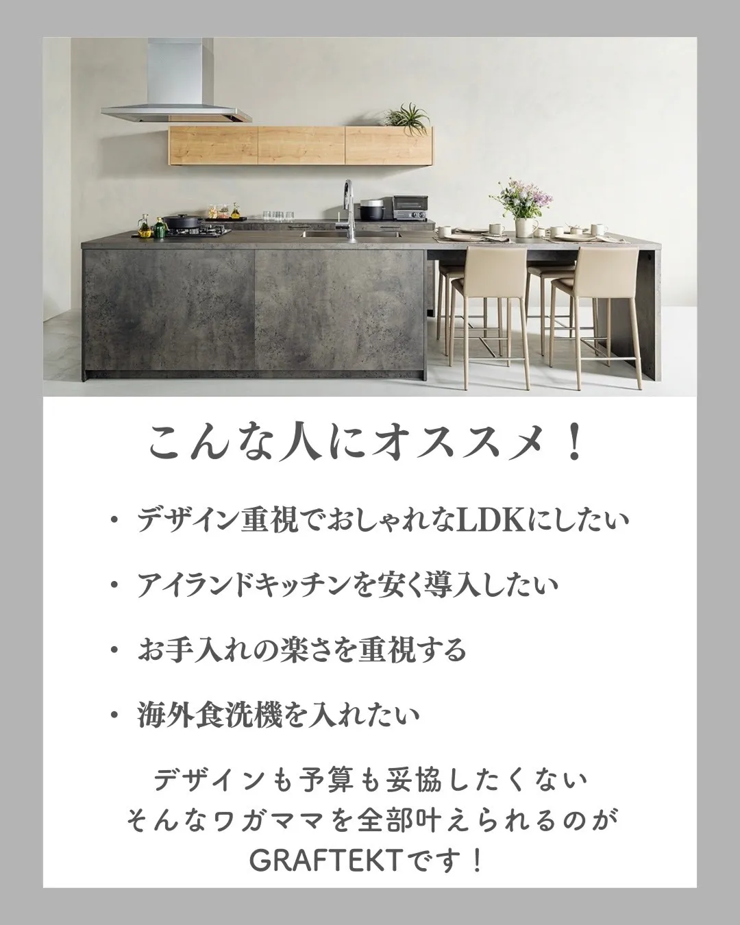 こんな人にオススメ! デザイン重視でおしゃれなLDKにしたい、アイランドキッチンを安く導入したい、お手入れの楽さを重視する、海外食洗機を入れたい。デザインも予算も妥協したくない、そんなワガママを全部叶えられるのがGRAFTEKTです!