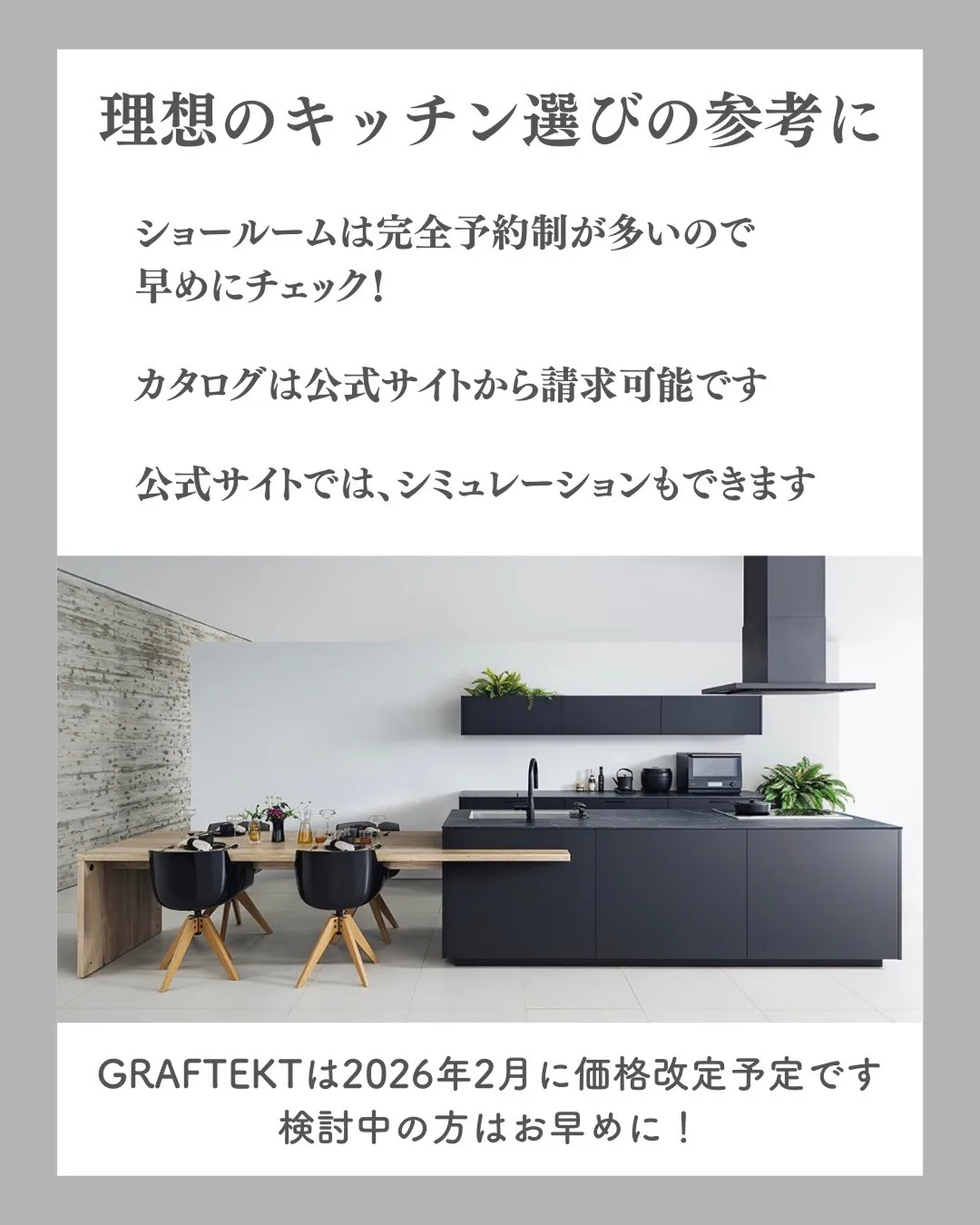 理想のキッチン選びの参考に。ショールームは完全予約制が多いので早めにチェック! カタログは公式サイトから請求可能です。公式サイトでは、シミュレーションもできます。GRAFTEKTは2026年2月に価格改定予定です。