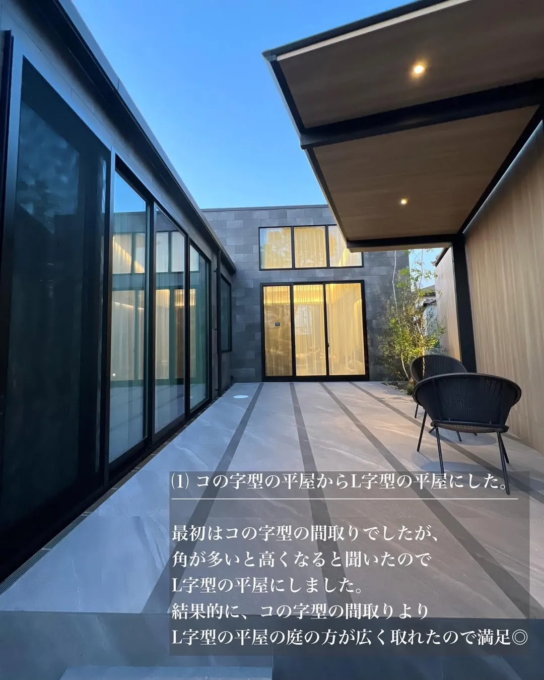 最初はコの字型の間取りを検討していましたが、角が多いと建築費用が高くなると聞いたため、L字型の平屋に変更しました。結果的に、コの字型の間取りよりも庭を広く取ることができ、大変満足しています。