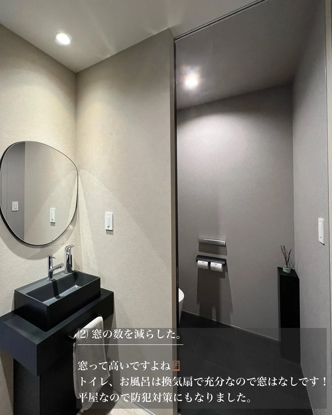 窓の設置費用は高額なため、トイレやお風呂は換気扇で十分と判断し、窓をなくしました。平屋であるため、これにより防犯対策も強化され、一石二鳥の減額ポイントとなりました。