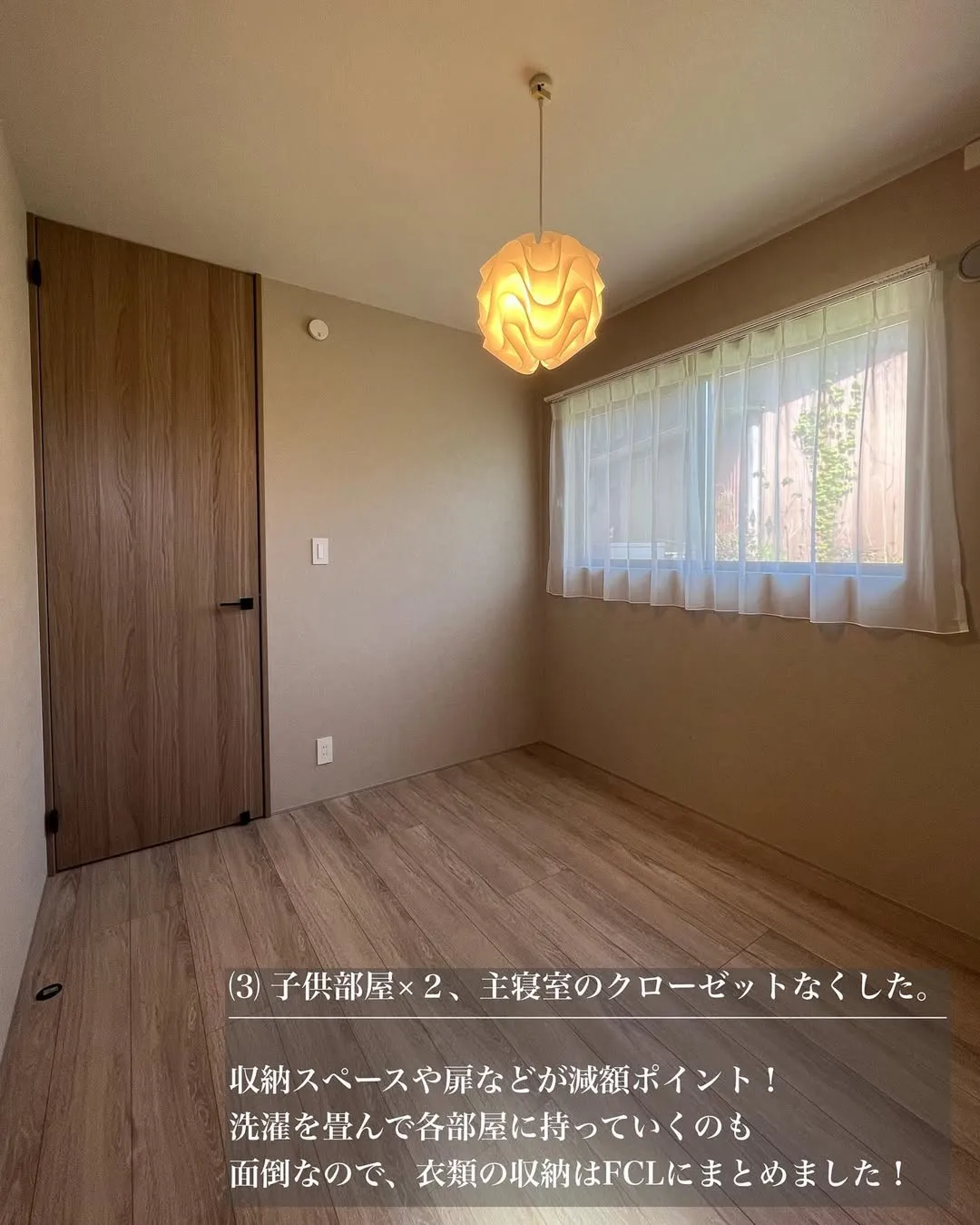 子供部屋2部屋と主寝室のクローゼットをなくしました。収納スペースや扉を減らすことは減額ポイントになります。また、洗濯物を畳んで各部屋に持っていく手間を省くため、衣類の収納はすべてファミリークローゼット(FCL)にまとめました。