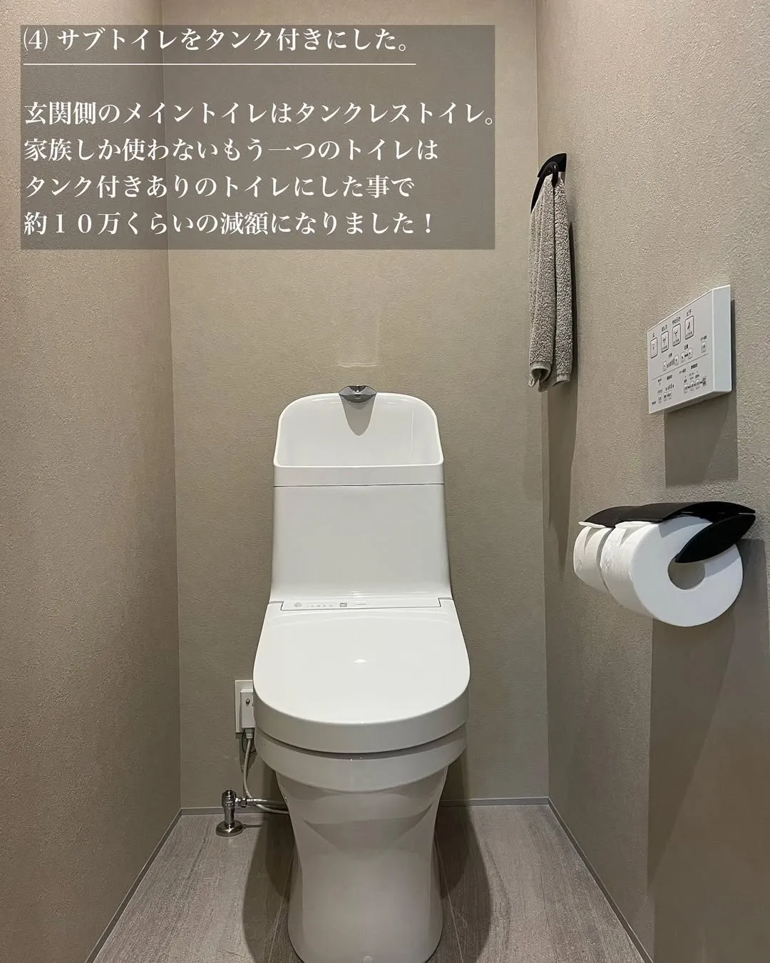 玄関側のメイントイレはタンクレストイレを採用しましたが、家族しか使わないサブトイレはタンク付きにしました。これにより約10万円の減額に成功しました。
