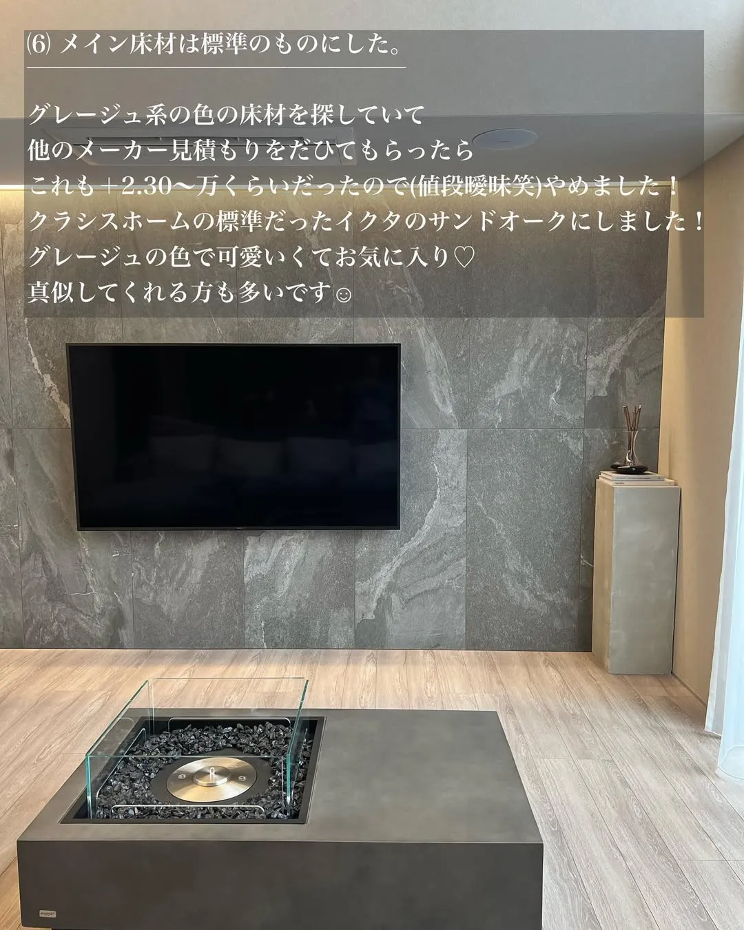 グレージュ系の床材を探していましたが、他のメーカーで見積もりを出してもらったところ、20〜30万円ほど高くなることが分かり、断念しました。結果、クラシスホームの標準品であるイクタのサンドオークを採用。このグレージュの色合いが可愛らしく、お気に入りです。真似してくださる方も多いです。