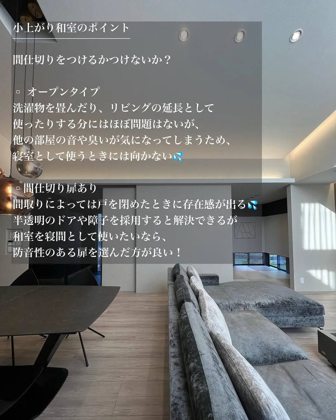 奥行き感を演出できるイメージがあるが、リビングの広さや天井の高さ、和室の位置によっては、逆にリビングが狭く見えてしまうこともある🙌🏻
