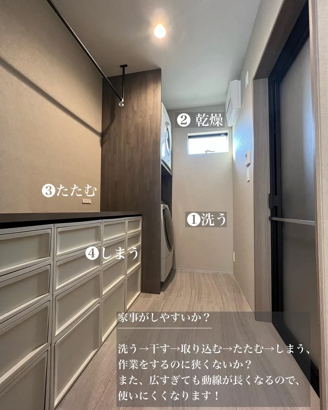 洗う→干す→取り込む→たたむ→しまう、作業をするのに狭くないか?また、広すぎても動線が長くなるので、使いにくくなります!