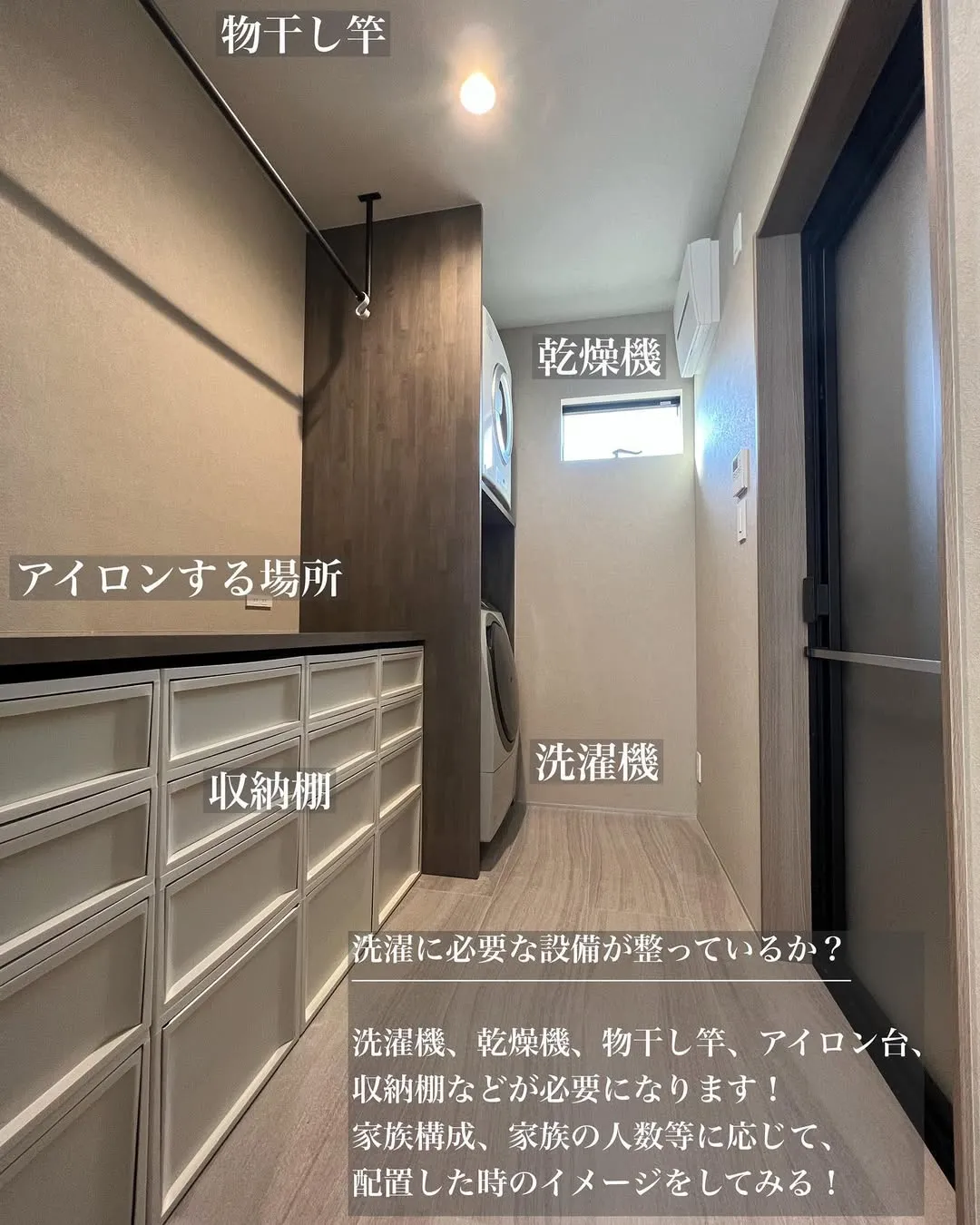 洗濯機、乾燥機、物干し竿、アイロン台、収納棚などが必要になります!家族構成、家族の人数等に応じて、配置した時のイメージをしてみましょう!