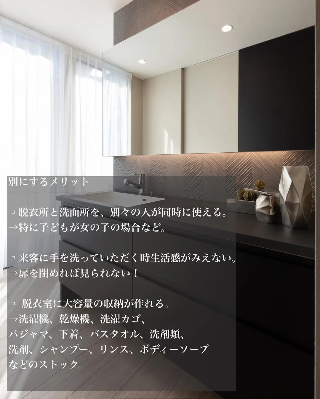 - 脱衣所と洗面所を、別々の人が同時に使える。