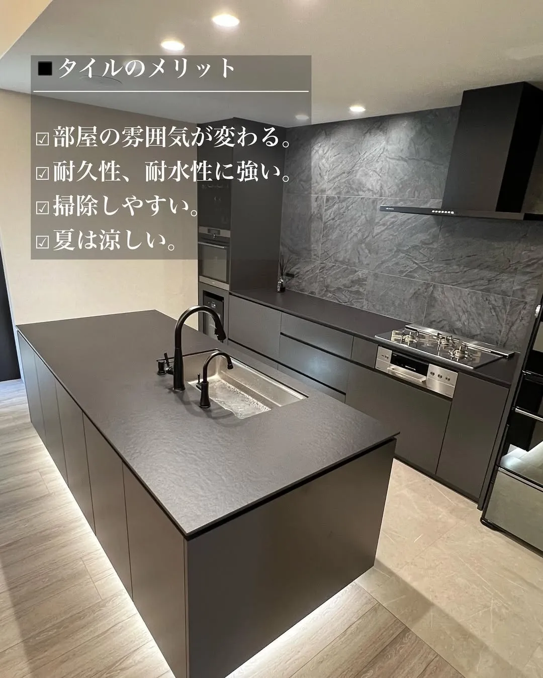 私達は、LDK全体の統一感をとにかくこだわってたのでキッチンの床をタイルなどにする事で空間が狭く見えてしまうのが不安でしたがメリットデメリット比較した結果フロアタイルにしました🥺